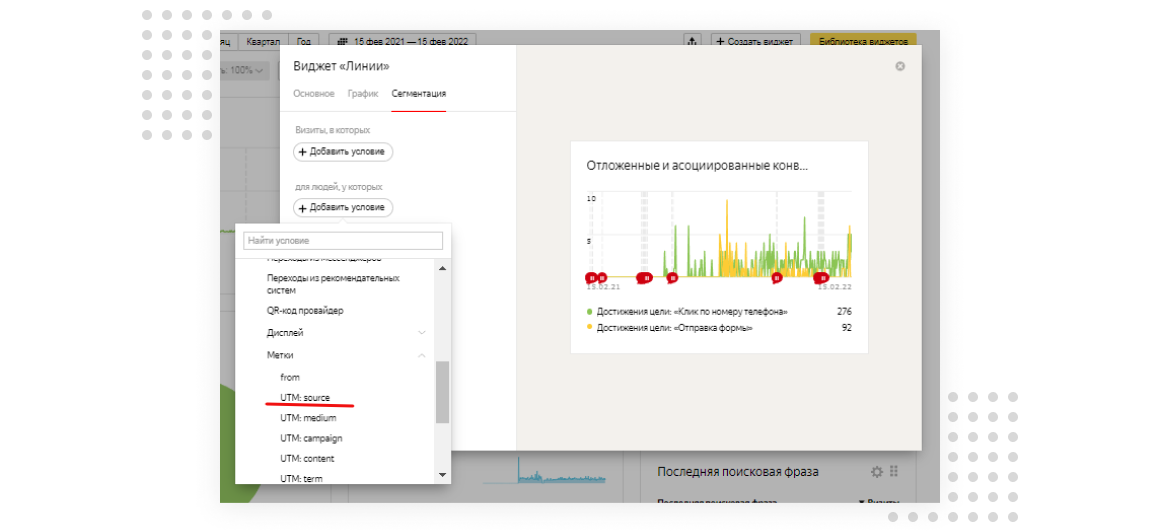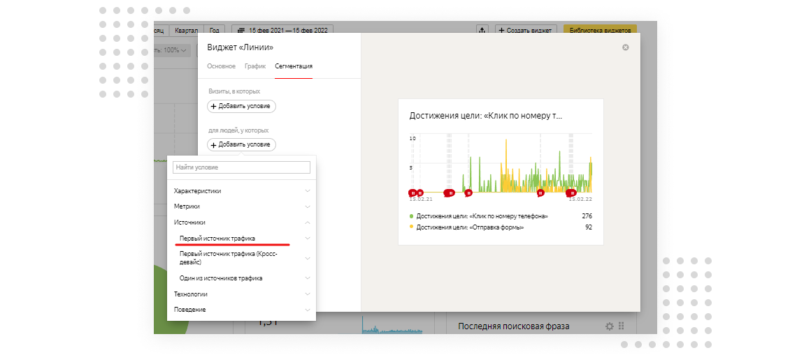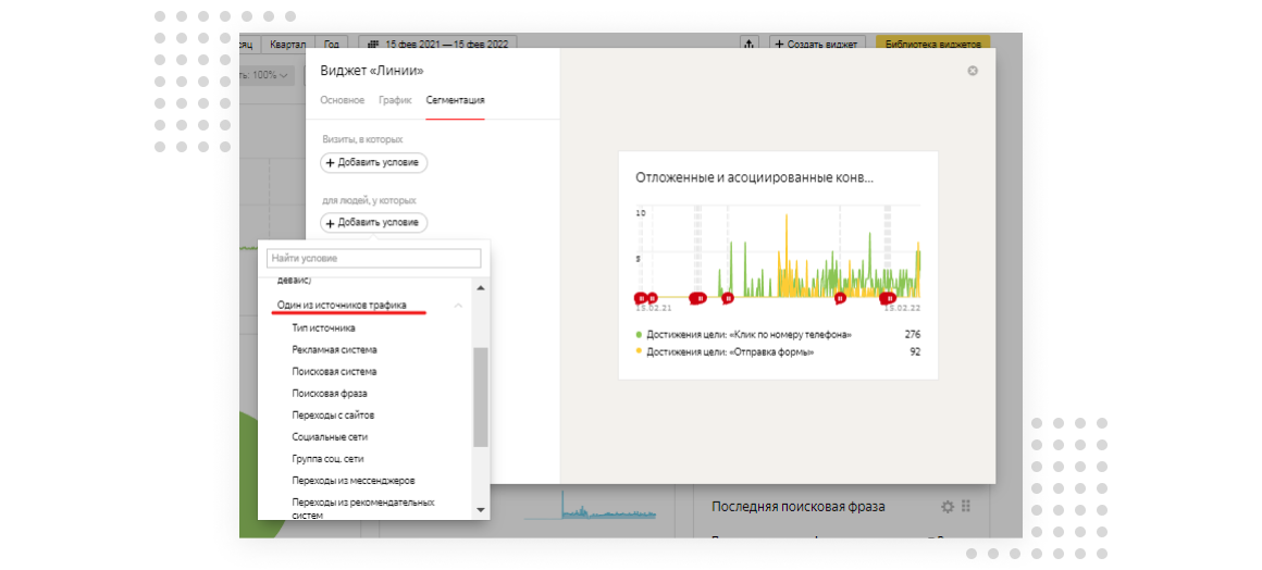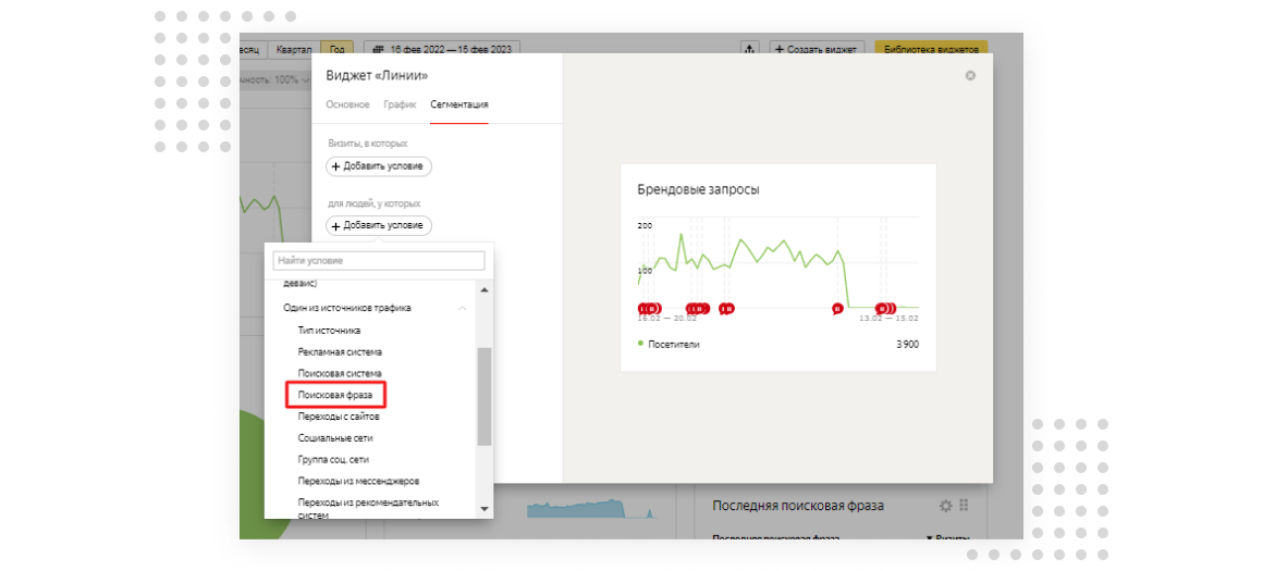 В линии графика задаем параметр «Посетители». Далее переходим в «Сегментация» и выбираем в качестве одного из источников трафика пункт «Поисковая фраза»: