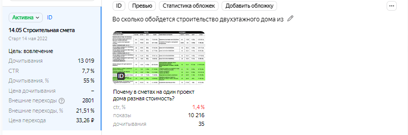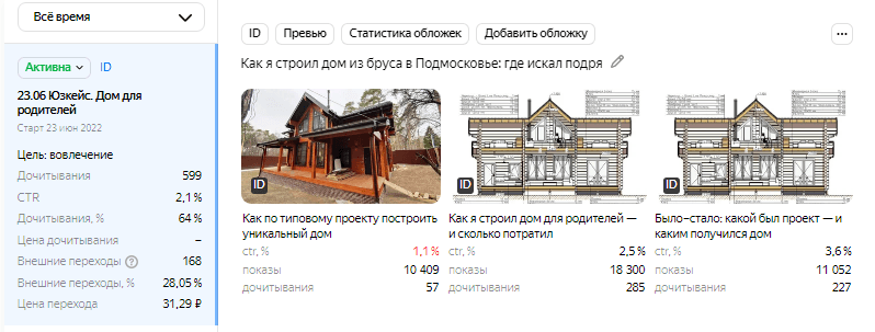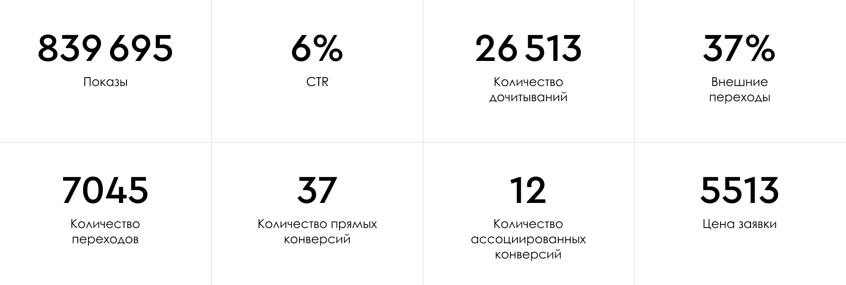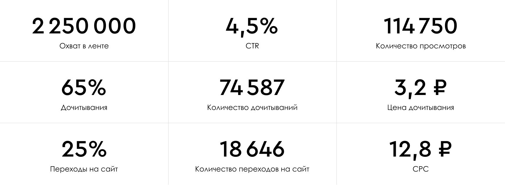 Пока статьи крутились в Яндекс Дзене, кампании давали ожидаемые медийные показатели: средний CTR у нас — 6,1%, дочитки — в среднем 60%. К слову, это выше официальных бенчмарков. Когда платформа релоцировалась в Яндекс ПромоСтраницы, начался период турбулентности. Мы поняли, что не стоит ориентироваться на привычные значения. Например, вырос потенциальный охват из-за того, что показы были не внутри самого Дзена, а во всей сети РСЯ — это плюс 50 млн пользователей.
