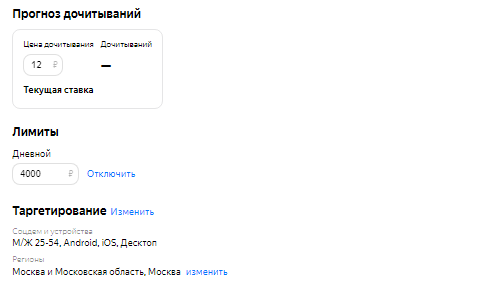 Скриншот из рекламного кабинета. На основе данных Яндекс Метрики о конверсиях скорректировали настройки таргета, чтобы получить больше трафика и достижений цели